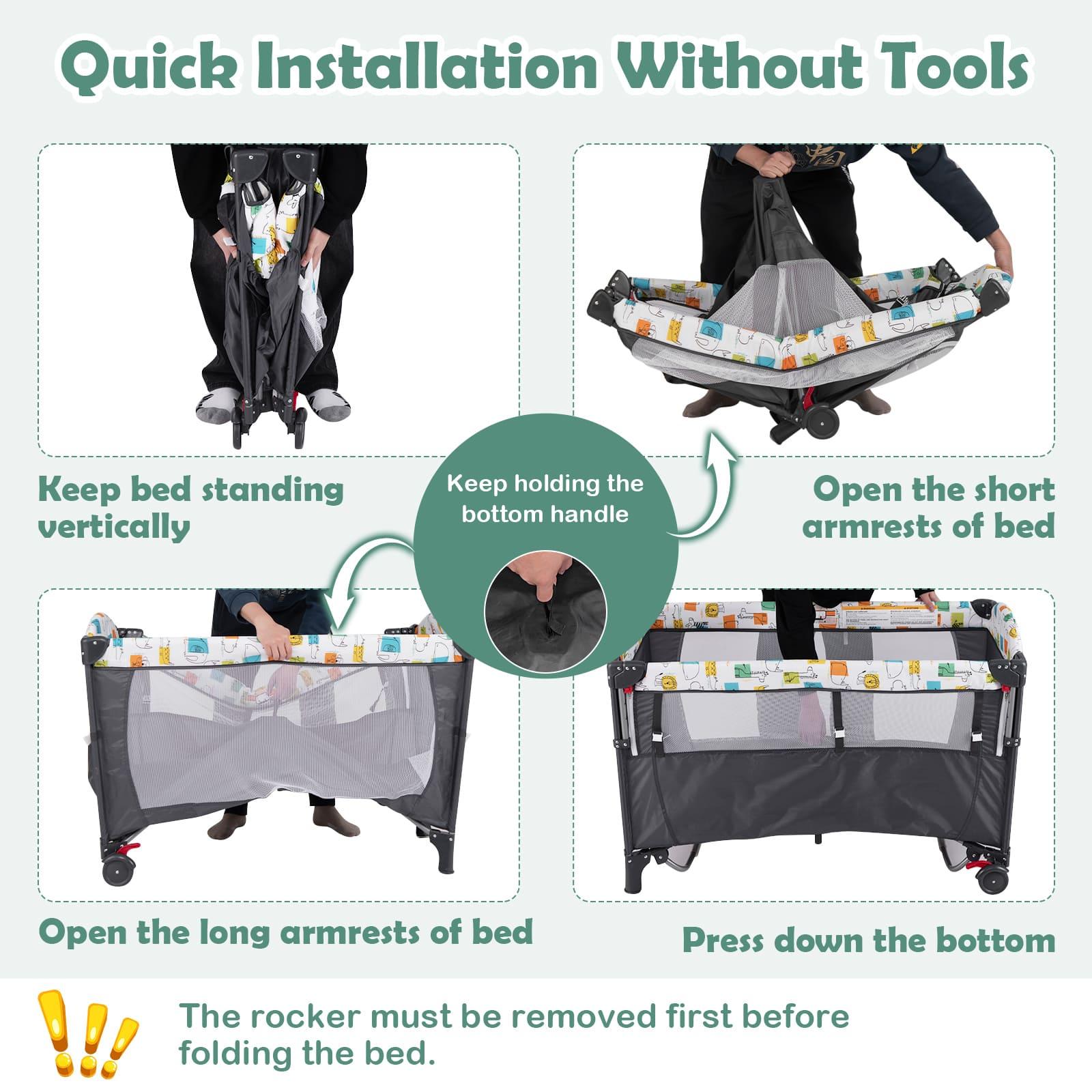 This 5-in-1 baby bassinet with a removable mattress, a diaper table and a zippered door meets all your baby's needs, from sleep, diaper changes to play. The bedside sleeper mode with a 4-level height adjustable side armrest makes it fit most adult beds, keeping your baby at an arm’s reach for easy feeding throughout the night. The cradle mode is helpful to lull the baby into a peaceful sleep. Moreover, the side storage basket, which can be mounted in different places on the crib rails based on your need, keeps everything organized. The lockable wheels make it easy to move around. In addition, this baby bassinet is ideal for travel with the foldable design and a convenient carry bag. Please note: the rocking bar must be removed first before folding the bed.